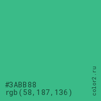 Цвет #3ABB88 в цветовой модели RGB обозначается тремя октетами (58, 187, 136) в десятичном формате и #3ABB88 в шестнадцатиричном (hex) формате, которые являются интенсивностью красного 58 (hex 3A), интенсивность зелёного 187 (hex BB) и интенсивность синего 136 (hex 88).