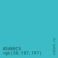 Цвет #3ABBC5 в цветовой модели RGB обозначается тремя октетами (58, 187, 197) в десятичном формате и #3ABBC5 в шестнадцатиричном (hex) формате, которые являются интенсивностью красного 58 (hex 3A), интенсивность зелёного 187 (hex BB) и интенсивность синего 197 (hex C5).