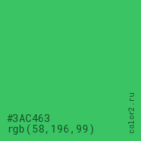 Цвет #3AC463 в цветовой модели RGB обозначается тремя октетами (58, 196, 99) в десятичном формате и #3AC463 в шестнадцатиричном (hex) формате, которые являются интенсивностью красного 58 (hex 3A), интенсивность зелёного 196 (hex C4) и интенсивность синего 99 (hex 63).
