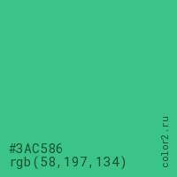 Цвет #3AC586 в цветовой модели RGB обозначается тремя октетами (58, 197, 134) в десятичном формате и #3AC586 в шестнадцатиричном (hex) формате, которые являются интенсивностью красного 58 (hex 3A), интенсивность зелёного 197 (hex C5) и интенсивность синего 134 (hex 86).