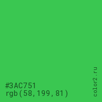 Цвет #3AC751 в цветовой модели RGB обозначается тремя октетами (58, 199, 81) в десятичном формате и #3AC751 в шестнадцатиричном (hex) формате, которые являются интенсивностью красного 58 (hex 3A), интенсивность зелёного 199 (hex C7) и интенсивность синего 81 (hex 51).