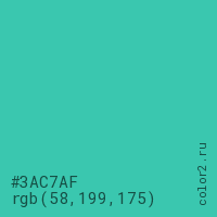 Цвет #3AC7AF в цветовой модели RGB обозначается тремя октетами (58, 199, 175) в десятичном формате и #3AC7AF в шестнадцатиричном (hex) формате, которые являются интенсивностью красного 58 (hex 3A), интенсивность зелёного 199 (hex C7) и интенсивность синего 175 (hex AF).