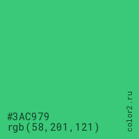 Цвет #3AC979 в цветовой модели RGB обозначается тремя октетами (58, 201, 121) в десятичном формате и #3AC979 в шестнадцатиричном (hex) формате, которые являются интенсивностью красного 58 (hex 3A), интенсивность зелёного 201 (hex C9) и интенсивность синего 121 (hex 79).