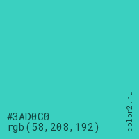 Цвет #3AD0C0 в цветовой модели RGB обозначается тремя октетами (58, 208, 192) в десятичном формате и #3AD0C0 в шестнадцатиричном (hex) формате, которые являются интенсивностью красного 58 (hex 3A), интенсивность зелёного 208 (hex D0) и интенсивность синего 192 (hex C0).