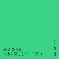 Цвет #3AD385 в цветовой модели RGB обозначается тремя октетами (58, 211, 133) в десятичном формате и #3AD385 в шестнадцатиричном (hex) формате, которые являются интенсивностью красного 58 (hex 3A), интенсивность зелёного 211 (hex D3) и интенсивность синего 133 (hex 85).