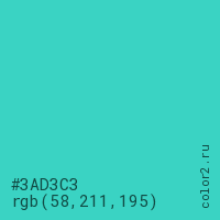 Цвет #3AD3C3 в цветовой модели RGB обозначается тремя октетами (58, 211, 195) в десятичном формате и #3AD3C3 в шестнадцатиричном (hex) формате, которые являются интенсивностью красного 58 (hex 3A), интенсивность зелёного 211 (hex D3) и интенсивность синего 195 (hex C3).