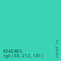 Цвет #3AD4B5 в цветовой модели RGB обозначается тремя октетами (58, 212, 181) в десятичном формате и #3AD4B5 в шестнадцатиричном (hex) формате, которые являются интенсивностью красного 58 (hex 3A), интенсивность зелёного 212 (hex D4) и интенсивность синего 181 (hex B5).