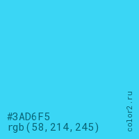 Цвет #3AD6F5 в цветовой модели RGB обозначается тремя октетами (58, 214, 245) в десятичном формате и #3AD6F5 в шестнадцатиричном (hex) формате, которые являются интенсивностью красного 58 (hex 3A), интенсивность зелёного 214 (hex D6) и интенсивность синего 245 (hex F5).
