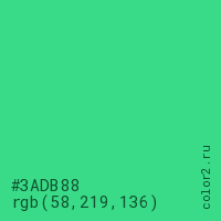Цвет #3ADB88 в цветовой модели RGB обозначается тремя октетами (58, 219, 136) в десятичном формате и #3ADB88 в шестнадцатиричном (hex) формате, которые являются интенсивностью красного 58 (hex 3A), интенсивность зелёного 219 (hex DB) и интенсивность синего 136 (hex 88).