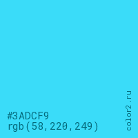 Цвет #3ADCF9 в цветовой модели RGB обозначается тремя октетами (58, 220, 249) в десятичном формате и #3ADCF9 в шестнадцатиричном (hex) формате, которые являются интенсивностью красного 58 (hex 3A), интенсивность зелёного 220 (hex DC) и интенсивность синего 249 (hex F9).