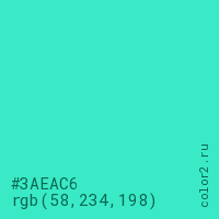 Цвет #3AEAC6 в цветовой модели RGB обозначается тремя октетами (58, 234, 198) в десятичном формате и #3AEAC6 в шестнадцатиричном (hex) формате, которые являются интенсивностью красного 58 (hex 3A), интенсивность зелёного 234 (hex EA) и интенсивность синего 198 (hex C6).