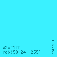 Цвет #3AF1FF в цветовой модели RGB обозначается тремя октетами (58, 241, 255) в десятичном формате и #3AF1FF в шестнадцатиричном (hex) формате, которые являются интенсивностью красного 58 (hex 3A), интенсивность зелёного 241 (hex F1) и интенсивность синего 255 (hex FF).
