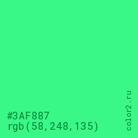 Цвет #3AF887 в цветовой модели RGB обозначается тремя октетами (58, 248, 135) в десятичном формате и #3AF887 в шестнадцатиричном (hex) формате, которые являются интенсивностью красного 58 (hex 3A), интенсивность зелёного 248 (hex F8) и интенсивность синего 135 (hex 87).