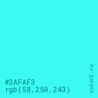 Цвет #3AFAF3 в цветовой модели RGB обозначается тремя октетами (58, 250, 243) в десятичном формате и #3AFAF3 в шестнадцатиричном (hex) формате, которые являются интенсивностью красного 58 (hex 3A), интенсивность зелёного 250 (hex FA) и интенсивность синего 243 (hex F3).