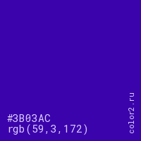 Цвет #3B03AC в цветовой модели RGB обозначается тремя октетами (59, 3, 172) в десятичном формате и #3B03AC в шестнадцатиричном (hex) формате, которые являются интенсивностью красного 59 (hex 3B), интенсивность зелёного 3 (hex 03) и интенсивность синего 172 (hex AC).