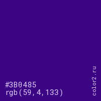 Цвет #3B0485 в цветовой модели RGB обозначается тремя октетами (59, 4, 133) в десятичном формате и #3B0485 в шестнадцатиричном (hex) формате, которые являются интенсивностью красного 59 (hex 3B), интенсивность зелёного 4 (hex 04) и интенсивность синего 133 (hex 85).