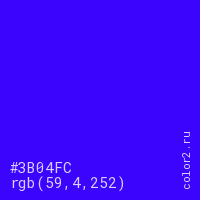 Цвет #3B04FC в цветовой модели RGB обозначается тремя октетами (59, 4, 252) в десятичном формате и #3B04FC в шестнадцатиричном (hex) формате, которые являются интенсивностью красного 59 (hex 3B), интенсивность зелёного 4 (hex 04) и интенсивность синего 252 (hex FC).