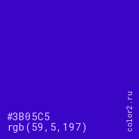 Цвет #3B05C5 в цветовой модели RGB обозначается тремя октетами (59, 5, 197) в десятичном формате и #3B05C5 в шестнадцатиричном (hex) формате, которые являются интенсивностью красного 59 (hex 3B), интенсивность зелёного 5 (hex 05) и интенсивность синего 197 (hex C5).