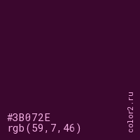 Цвет #3B072E в цветовой модели RGB обозначается тремя октетами (59, 7, 46) в десятичном формате и #3B072E в шестнадцатиричном (hex) формате, которые являются интенсивностью красного 59 (hex 3B), интенсивность зелёного 7 (hex 07) и интенсивность синего 46 (hex 2E).