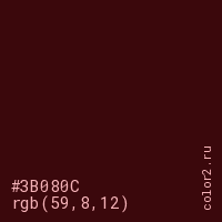 Цвет #3B080C в цветовой модели RGB обозначается тремя октетами (59, 8, 12) в десятичном формате и #3B080C в шестнадцатиричном (hex) формате, которые являются интенсивностью красного 59 (hex 3B), интенсивность зелёного 8 (hex 08) и интенсивность синего 12 (hex 0C).