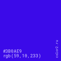 Цвет #3B0AE9 в цветовой модели RGB обозначается тремя октетами (59, 10, 233) в десятичном формате и #3B0AE9 в шестнадцатиричном (hex) формате, которые являются интенсивностью красного 59 (hex 3B), интенсивность зелёного 10 (hex 0A) и интенсивность синего 233 (hex E9).