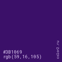 Цвет #3B1069 в цветовой модели RGB обозначается тремя октетами (59, 16, 105) в десятичном формате и #3B1069 в шестнадцатиричном (hex) формате, которые являются интенсивностью красного 59 (hex 3B), интенсивность зелёного 16 (hex 10) и интенсивность синего 105 (hex 69).