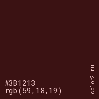 Цвет #3B1213 в цветовой модели RGB обозначается тремя октетами (59, 18, 19) в десятичном формате и #3B1213 в шестнадцатиричном (hex) формате, которые являются интенсивностью красного 59 (hex 3B), интенсивность зелёного 18 (hex 12) и интенсивность синего 19 (hex 13).