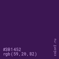 Цвет #3B1452 в цветовой модели RGB обозначается тремя октетами (59, 20, 82) в десятичном формате и #3B1452 в шестнадцатиричном (hex) формате, которые являются интенсивностью красного 59 (hex 3B), интенсивность зелёного 20 (hex 14) и интенсивность синего 82 (hex 52).