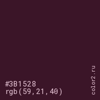 Цвет #3B1528 в цветовой модели RGB обозначается тремя октетами (59, 21, 40) в десятичном формате и #3B1528 в шестнадцатиричном (hex) формате, которые являются интенсивностью красного 59 (hex 3B), интенсивность зелёного 21 (hex 15) и интенсивность синего 40 (hex 28).