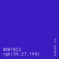 Цвет #3B1BC2 в цветовой модели RGB обозначается тремя октетами (59, 27, 194) в десятичном формате и #3B1BC2 в шестнадцатиричном (hex) формате, которые являются интенсивностью красного 59 (hex 3B), интенсивность зелёного 27 (hex 1B) и интенсивность синего 194 (hex C2).