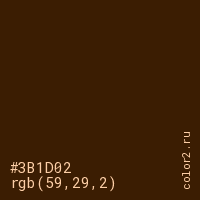 Цвет #3B1D02 в цветовой модели RGB обозначается тремя октетами (59, 29, 2) в десятичном формате и #3B1D02 в шестнадцатиричном (hex) формате, которые являются интенсивностью красного 59 (hex 3B), интенсивность зелёного 29 (hex 1D) и интенсивность синего 2 (hex 02).