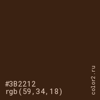 Цвет #3B2212 в цветовой модели RGB обозначается тремя октетами (59, 34, 18) в десятичном формате и #3B2212 в шестнадцатиричном (hex) формате, которые являются интенсивностью красного 59 (hex 3B), интенсивность зелёного 34 (hex 22) и интенсивность синего 18 (hex 12).