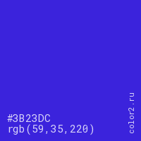 Цвет #3B23DC в цветовой модели RGB обозначается тремя октетами (59, 35, 220) в десятичном формате и #3B23DC в шестнадцатиричном (hex) формате, которые являются интенсивностью красного 59 (hex 3B), интенсивность зелёного 35 (hex 23) и интенсивность синего 220 (hex DC).