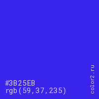 Цвет #3B25EB в цветовой модели RGB обозначается тремя октетами (59, 37, 235) в десятичном формате и #3B25EB в шестнадцатиричном (hex) формате, которые являются интенсивностью красного 59 (hex 3B), интенсивность зелёного 37 (hex 25) и интенсивность синего 235 (hex EB).