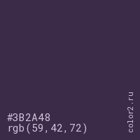 Цвет #3B2A48 в цветовой модели RGB обозначается тремя октетами (59, 42, 72) в десятичном формате и #3B2A48 в шестнадцатиричном (hex) формате, которые являются интенсивностью красного 59 (hex 3B), интенсивность зелёного 42 (hex 2A) и интенсивность синего 72 (hex 48).