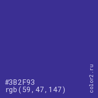Цвет #3B2F93 в цветовой модели RGB обозначается тремя октетами (59, 47, 147) в десятичном формате и #3B2F93 в шестнадцатиричном (hex) формате, которые являются интенсивностью красного 59 (hex 3B), интенсивность зелёного 47 (hex 2F) и интенсивность синего 147 (hex 93).