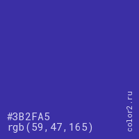 Цвет #3B2FA5 в цветовой модели RGB обозначается тремя октетами (59, 47, 165) в десятичном формате и #3B2FA5 в шестнадцатиричном (hex) формате, которые являются интенсивностью красного 59 (hex 3B), интенсивность зелёного 47 (hex 2F) и интенсивность синего 165 (hex A5).