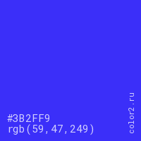 Цвет #3B2FF9 в цветовой модели RGB обозначается тремя октетами (59, 47, 249) в десятичном формате и #3B2FF9 в шестнадцатиричном (hex) формате, которые являются интенсивностью красного 59 (hex 3B), интенсивность зелёного 47 (hex 2F) и интенсивность синего 249 (hex F9).