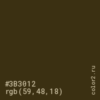 Цвет #3B3012 в цветовой модели RGB обозначается тремя октетами (59, 48, 18) в десятичном формате и #3B3012 в шестнадцатиричном (hex) формате, которые являются интенсивностью красного 59 (hex 3B), интенсивность зелёного 48 (hex 30) и интенсивность синего 18 (hex 12).