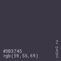Цвет #3B3745 в цветовой модели RGB обозначается тремя октетами (59, 55, 69) в десятичном формате и #3B3745 в шестнадцатиричном (hex) формате, которые являются интенсивностью красного 59 (hex 3B), интенсивность зелёного 55 (hex 37) и интенсивность синего 69 (hex 45).