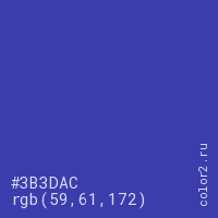 Цвет #3B3DAC в цветовой модели RGB обозначается тремя октетами (59, 61, 172) в десятичном формате и #3B3DAC в шестнадцатиричном (hex) формате, которые являются интенсивностью красного 59 (hex 3B), интенсивность зелёного 61 (hex 3D) и интенсивность синего 172 (hex AC).