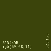 Цвет #3B440B в цветовой модели RGB обозначается тремя октетами (59, 68, 11) в десятичном формате и #3B440B в шестнадцатиричном (hex) формате, которые являются интенсивностью красного 59 (hex 3B), интенсивность зелёного 68 (hex 44) и интенсивность синего 11 (hex 0B).