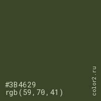 Цвет #3B4629 в цветовой модели RGB обозначается тремя октетами (59, 70, 41) в десятичном формате и #3B4629 в шестнадцатиричном (hex) формате, которые являются интенсивностью красного 59 (hex 3B), интенсивность зелёного 70 (hex 46) и интенсивность синего 41 (hex 29).