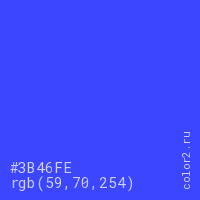Цвет #3B46FE в цветовой модели RGB обозначается тремя октетами (59, 70, 254) в десятичном формате и #3B46FE в шестнадцатиричном (hex) формате, которые являются интенсивностью красного 59 (hex 3B), интенсивность зелёного 70 (hex 46) и интенсивность синего 254 (hex FE).