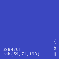 Цвет #3B47C1 в цветовой модели RGB обозначается тремя октетами (59, 71, 193) в десятичном формате и #3B47C1 в шестнадцатиричном (hex) формате, которые являются интенсивностью красного 59 (hex 3B), интенсивность зелёного 71 (hex 47) и интенсивность синего 193 (hex C1).
