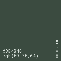 Цвет #3B4B40 в цветовой модели RGB обозначается тремя октетами (59, 75, 64) в десятичном формате и #3B4B40 в шестнадцатиричном (hex) формате, которые являются интенсивностью красного 59 (hex 3B), интенсивность зелёного 75 (hex 4B) и интенсивность синего 64 (hex 40).