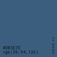 Цвет #3B5E7E в цветовой модели RGB обозначается тремя октетами (59, 94, 126) в десятичном формате и #3B5E7E в шестнадцатиричном (hex) формате, которые являются интенсивностью красного 59 (hex 3B), интенсивность зелёного 94 (hex 5E) и интенсивность синего 126 (hex 7E).