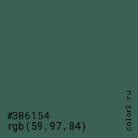 Цвет #3B6154 в цветовой модели RGB обозначается тремя октетами (59, 97, 84) в десятичном формате и #3B6154 в шестнадцатиричном (hex) формате, которые являются интенсивностью красного 59 (hex 3B), интенсивность зелёного 97 (hex 61) и интенсивность синего 84 (hex 54).