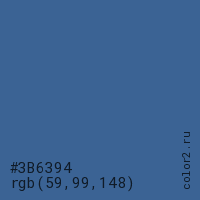 Цвет #3B6394 в цветовой модели RGB обозначается тремя октетами (59, 99, 148) в десятичном формате и #3B6394 в шестнадцатиричном (hex) формате, которые являются интенсивностью красного 59 (hex 3B), интенсивность зелёного 99 (hex 63) и интенсивность синего 148 (hex 94).
