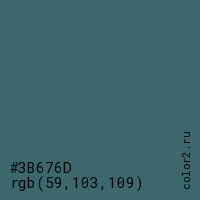 Цвет #3B676D в цветовой модели RGB обозначается тремя октетами (59, 103, 109) в десятичном формате и #3B676D в шестнадцатиричном (hex) формате, которые являются интенсивностью красного 59 (hex 3B), интенсивность зелёного 103 (hex 67) и интенсивность синего 109 (hex 6D).